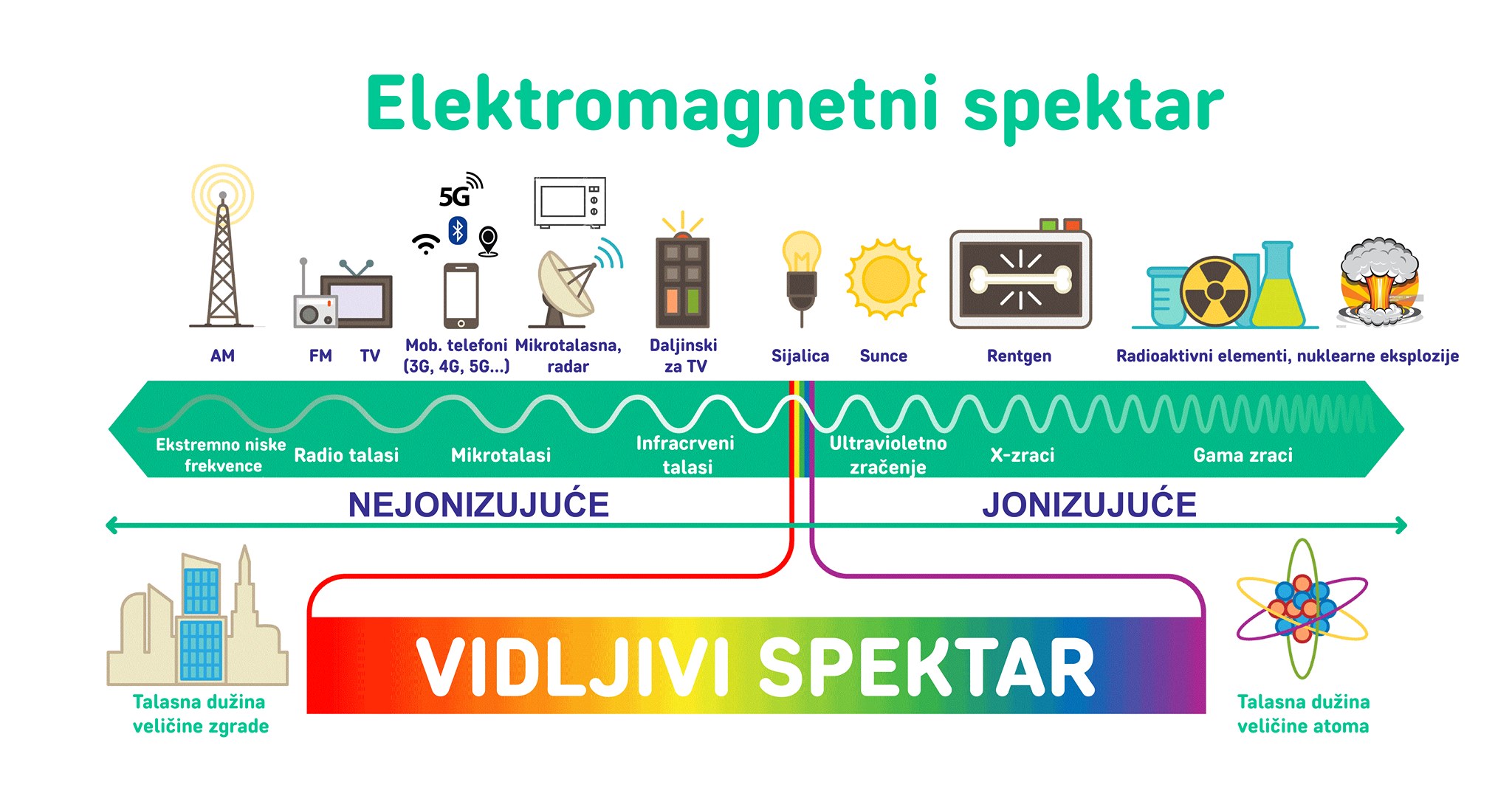 U objavama viđam da neki brinu da radio talasi mogu da izazovu rak (da oštete DNK). Apsolutno nijedan elektromagnetni talas niže frekvence od UV zračenja (na slici levo) nema dovoljnu energiju da izmeni ljudski DNK. Radio talasi su daleeeeko na sigurnoj strani u poređenju sa rentgenskim zracima i radioaktivnim gama zračenjem. Oni su bezazleniji od vidljive svetlosti, od Sunčeve svetlosti. 5G elektromagnetni talasi fundamentalno nemaju dovoljno energije da izbace elektrone iz atoma, da jonizuju atom, što je mehanizam po kojem se DNK nasilno menja/oštećuje.