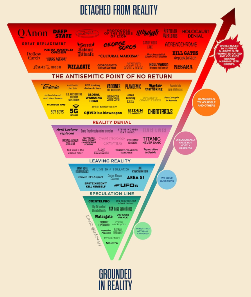 Die folgende grafische Darstellung, Verschwörungsschema 2021 [23], zeigt die Schritte der kognitiven Dissonanz in Bezug auf ein bestimmtes Thema:
